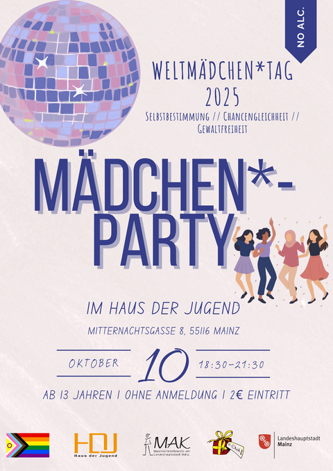 Um den Tag gebührend zu beenden, gibt es ab 18:30 Uhr zum Abschluss eine Mädchen*Party für Mädchen* ab 13 Jahren im Haus der Jugend.